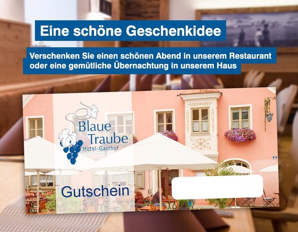 Mit einem Geschenkgutschein für die Blaue Traube bereiten Sie ihren Lieben eine Freude. Der Gutschein kann gleichermaßen in unserem Restaurant, wie auch für die Übernachtung in unseren gemütlichen Zimmern eingelöst werden. Den Wert können Sie selbst bestimmen, der Gutschein wird direkt im Anschluss an die Bezahlung generiert und zum Download bereitgestellt.